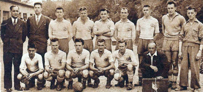 on remarquera parmi les joueurs :Georges BOUT le capitaine emblématique il tient la coupe , Louis HERMANT au 1° rang à gauche que l’on retouvera en 1949 , Julien TIEDREZ debout à l’extrême droite. Il disparaîtra en Juin 1940 lors des combats dans la Somme, essayant d’arrêter les Allemands qui foncent vers Dunkerque.